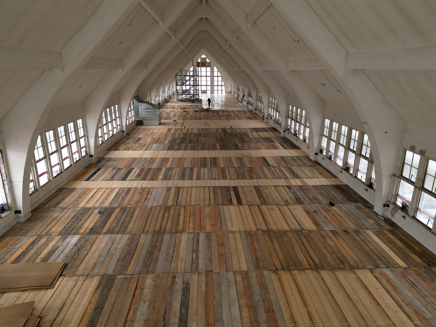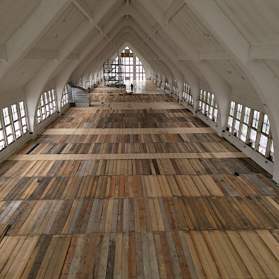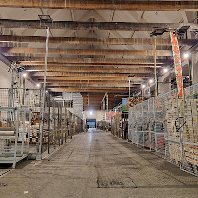 - 1.550m² Holzbohlenbelag im Innenraum, gegründet auf 16,00m langen Holzleimbindern